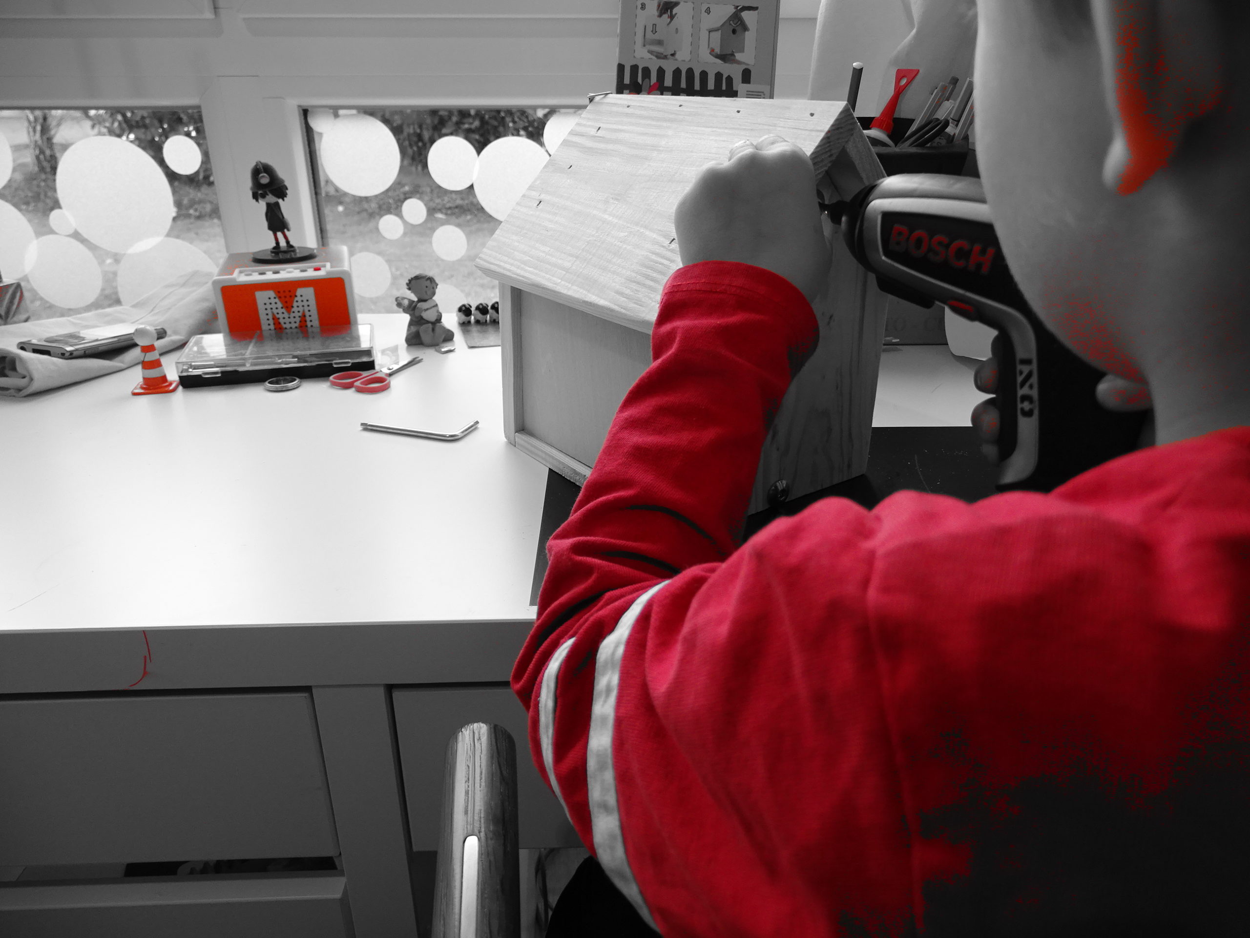 Wir haben gelesen, dass zum Beispiel Spatzen bedroht sind. Zu wenig Nistplätze, zu saubere Quartiere, kaum Büsche. Deshalb bauen wir nun Brutkästen und wollen diese im Quartier aufhängen. Nummer 1 ist schon mal zusammen geschraubt und mit einer grossen Portion Farbe versehen.