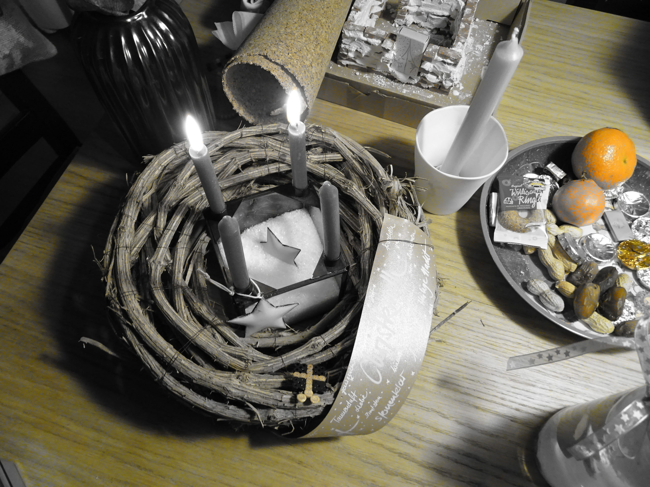 Das Schöne ist, dass wir zu 90% zusammen frühstücken. So weiss jeder was der andere am heutigen 12v12 im Dezember 2017 auf dem Programm hat. Die beiden Adventskärzli brennen.