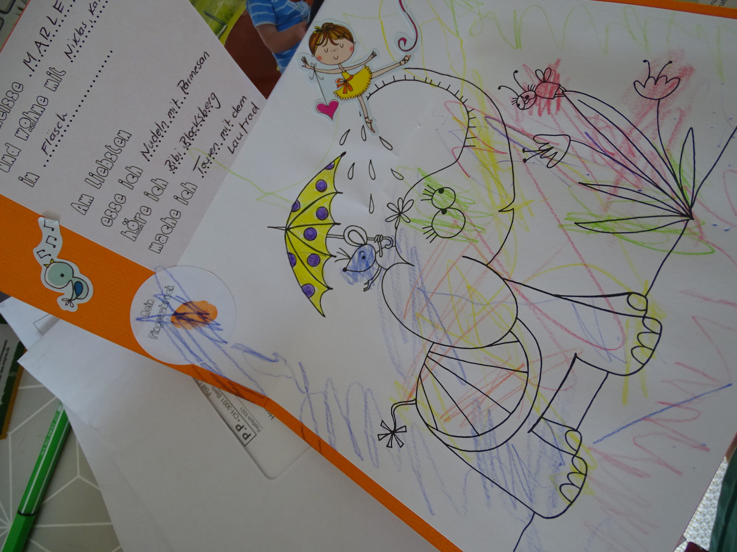 In der Mittagspause schauen wir die Post durch. Wau. Wieder eine Karte fürs Freundealbum ist retour gekommen. Ich habe eine Kleinkindervariante gebastelt und Mini-Me freut sich über die wunderbare Sammlung der Fläscher Kinder.