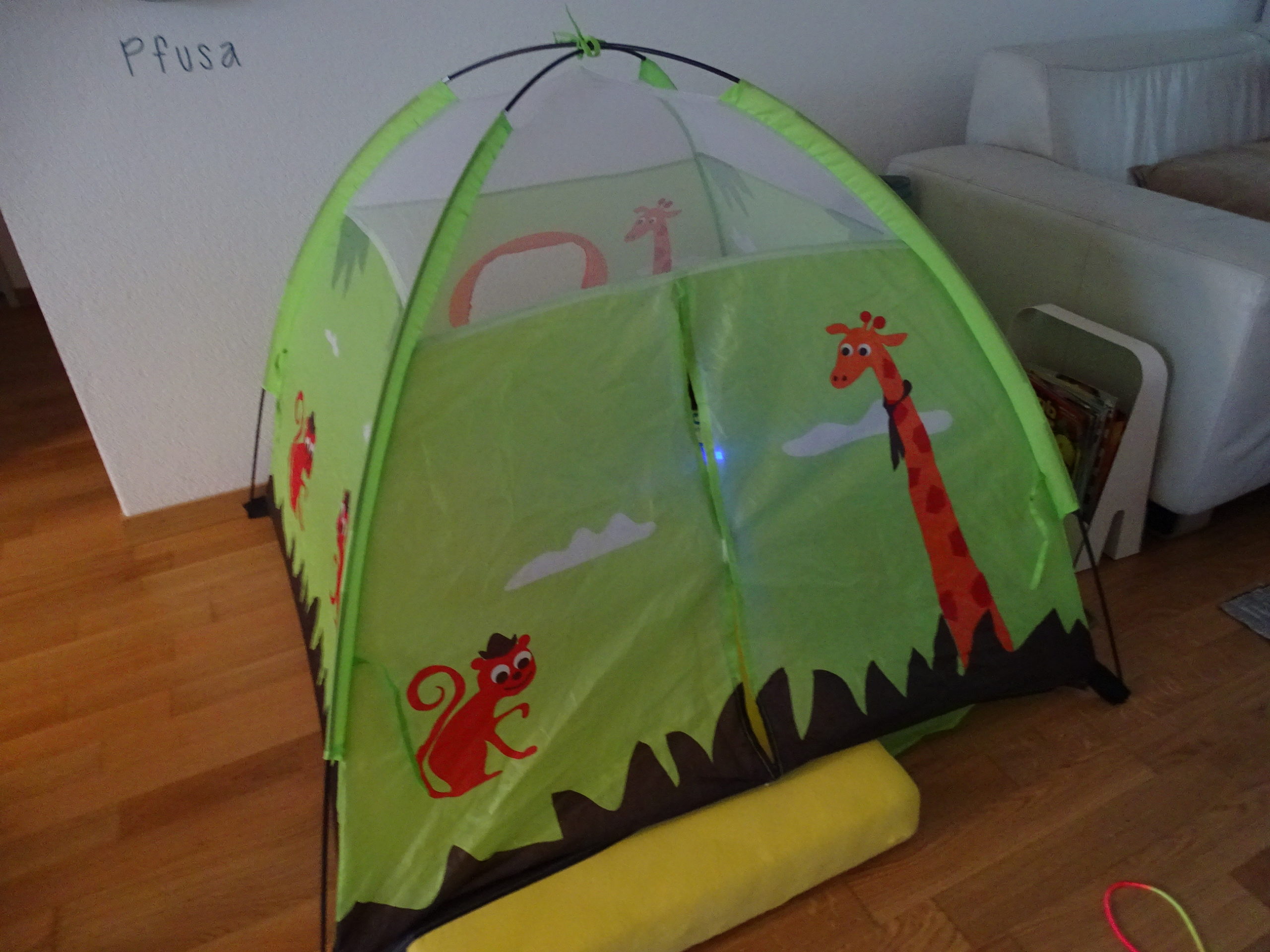 Jetzt chillt er noch ein bisschen in seinem Zelt und hört die neuste Globi CD.