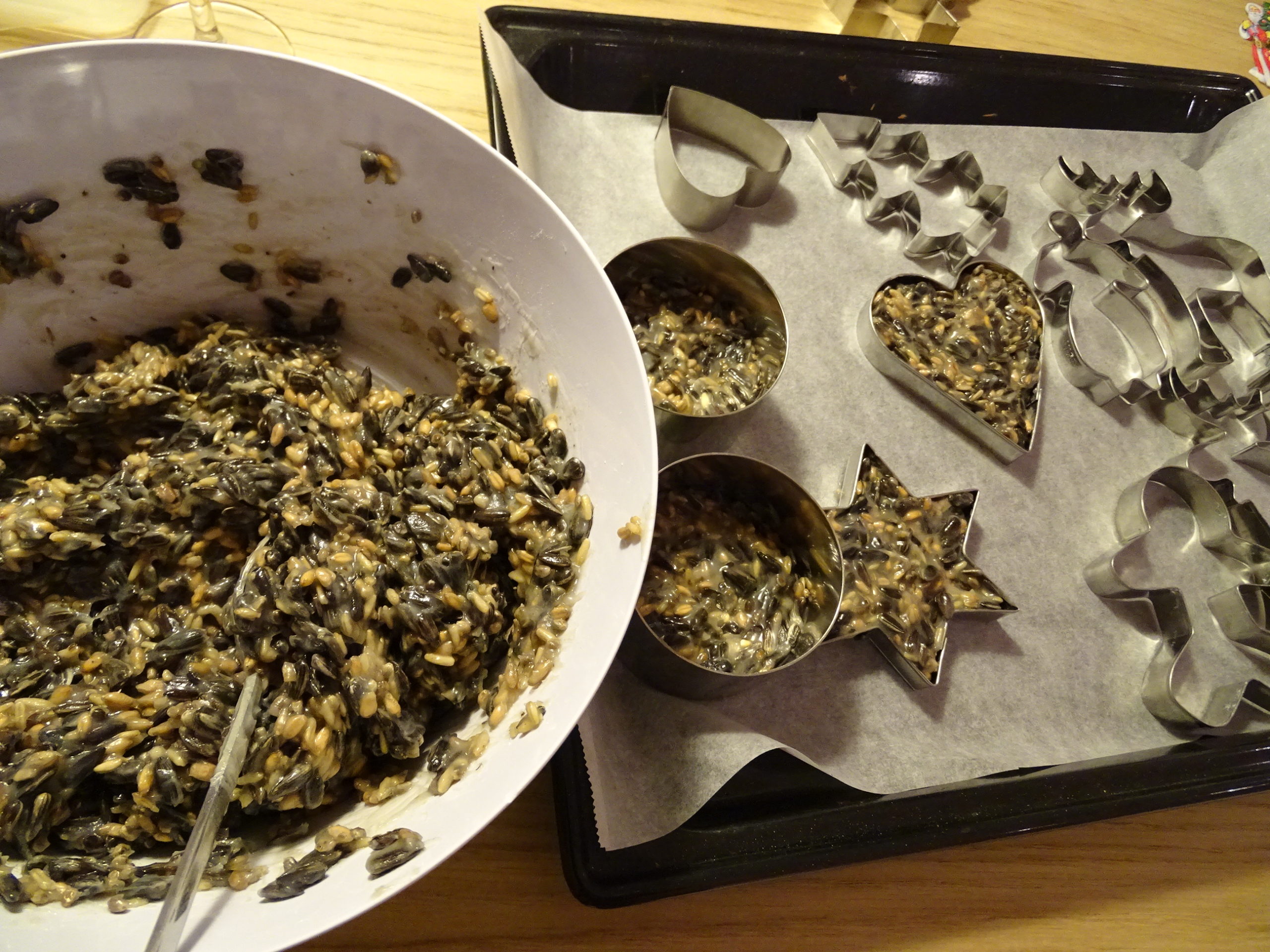 Das Kokosfett lässt du in einer weiten Pfannen schmelzen. Sobald es ganz flüssig ist, nimmst du es vom Herd und rührst das Vogelfutter unter. Nun kannst du die Masse entweder über Nacht stehen lassen oder draussen (hier ist aktuell 0 Grad) eindicken lassen. Wenn das ganze fest ist, lässt es sich wunderbar in Guetzliformen streichen. Schön festdrücken. Dabei bekommst du gleich gut gefettete Hände. Ideal an einem kalten Wintertag.
