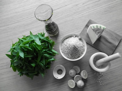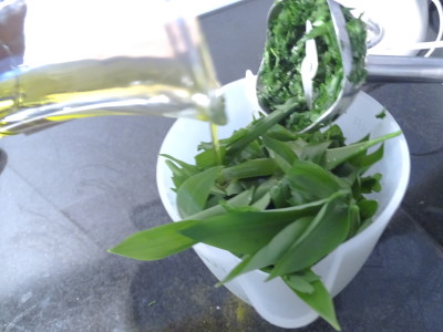 – Bärlauch grob schneiden und in hohem Gefäss mit dem Olivenöl pürieren. Je nach Vorliebe komplett pürieren oder einige Blätter in kleinen Stücken lassen.