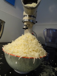 – Mandeln und Pecorino an der Bircherraffel (am besten an der Maschine) fein raffeln. Hast du keine Maschine, dann lass den Pecorino in der Käserei fein reiben und kaufe gemahlene Mandeln. Vielleicht hast du von Weihnachten ja noch welche übrig…