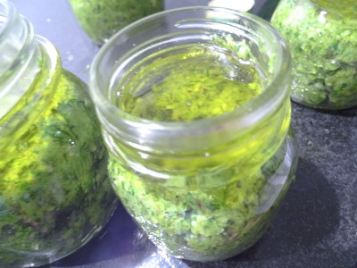 – Jetzt fühlst du alles in saubere Gläser mit Schraubverschluss. Um die Pesto zu konservieren gibst du Olivenöl darüber bis diese zugedeckt ist. Wenn du mal nur wenig davon brauchst, dann kannst du so die Sauce wieder konservieren.