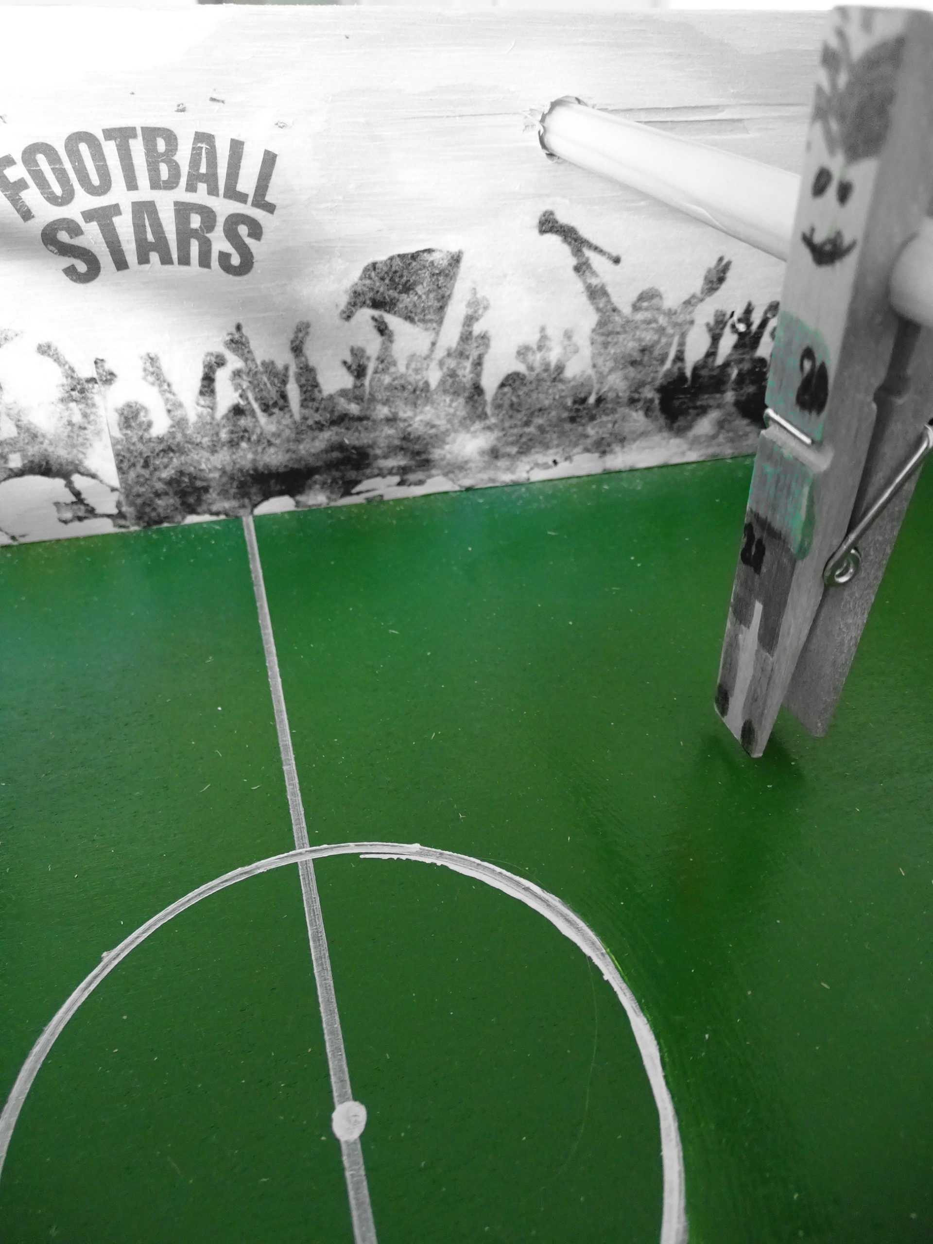 GG und Mini-Me haben diesen coolen Tischfussballkasten gebaut. Holz wurde angeschleppt. Google konsultiert wie den die Masse eines Fussballfeldes sind und die Dimension eines Goals in Erfahrung gebracht. Mini-Me durfte den Rasen ausrollen (streichen). Den „Klüperlis“ wurden die „richtigen“ Fussballdress inklusive den passenden Zahlen angezogen.