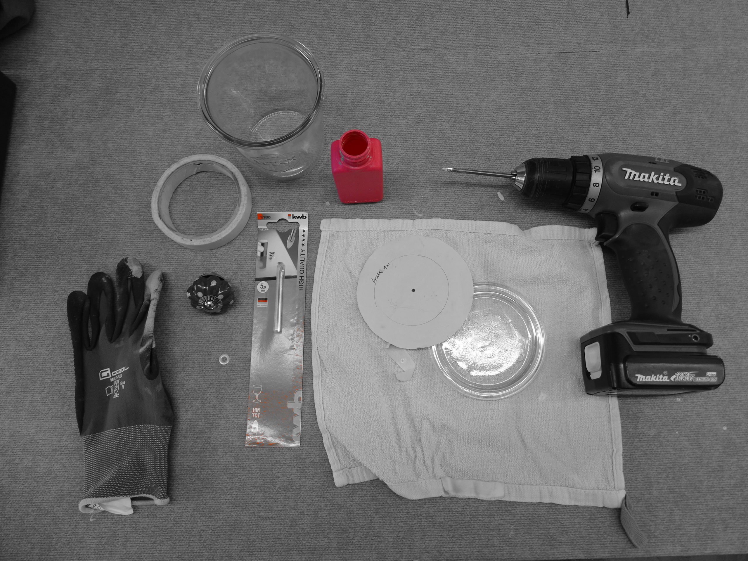 Akkubohrer, WECK Glas, Wasserbehälter, Pinsel, Frottetuch, Fliessenbohrer, Malerband, Schreiber, Schutzhandschuh, Möbelknauf.