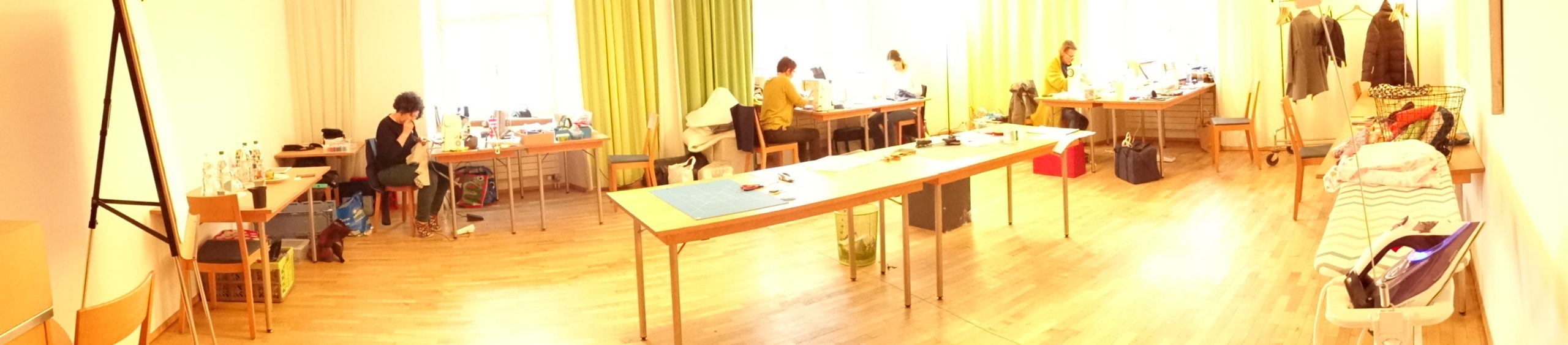 Die Stimmung ist locker und wir tauschen uns aus. Motivieren uns in unseren Vorhaben. Und güggslen uns Gegenseitig Handgriffe und Tricks ab. Streicheln über Nachbars Nähmaschine als ob’s eine Hundshow sei. Und bestaunen Stoffe die wir auch gerne hätten.