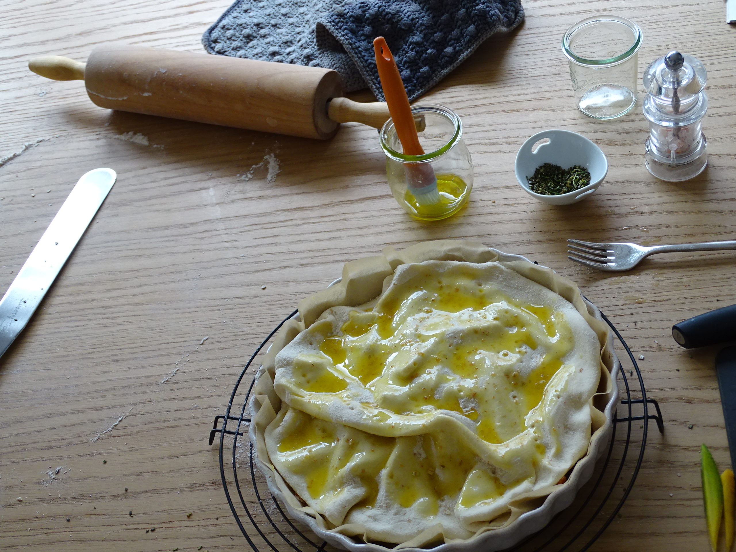 Auswahlen und das ganze damit rundherum schön bedecken. Mit Gabel einstechen und mit Olivenöl bestreichen.