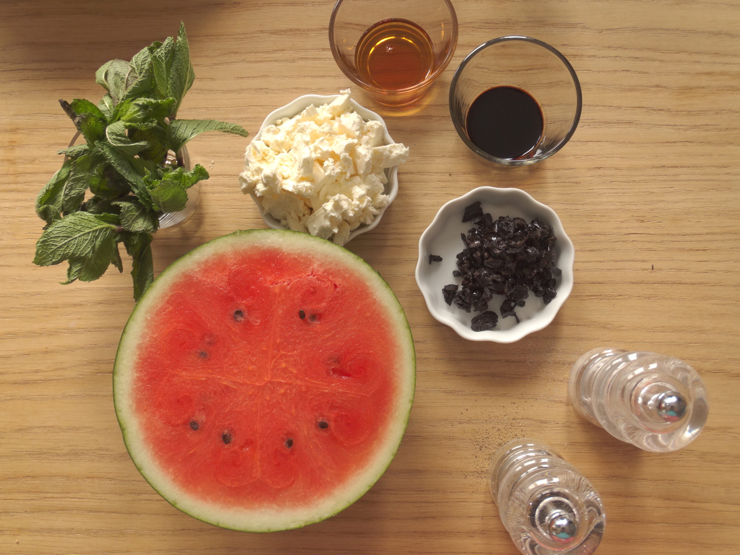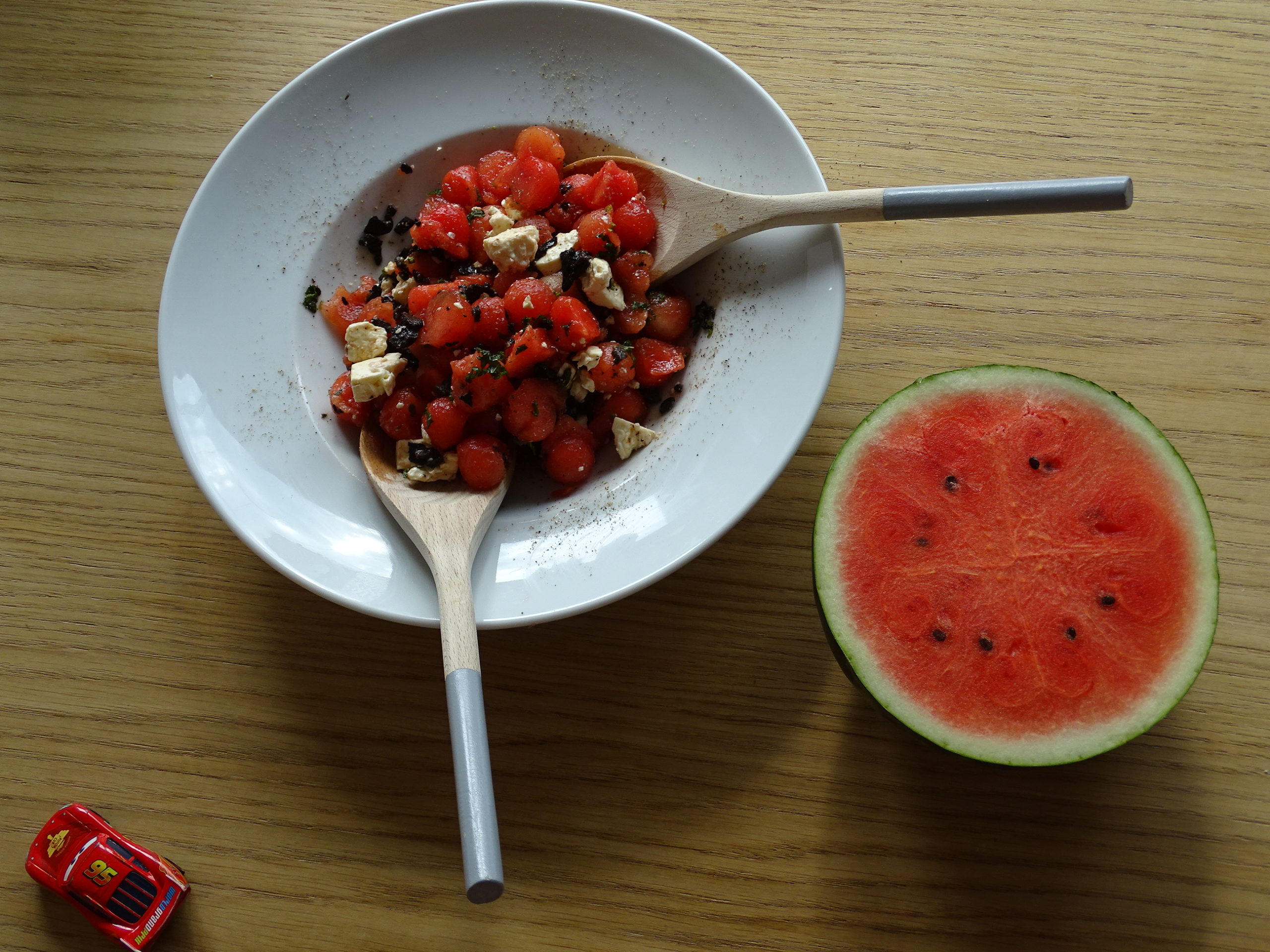 ->alle Zutaten bereitstellen und kurz vor dem Servieren vermengen. Bei einem Picknick alles, ausser die Wassermelone in eine Schüssel geben. Die Wassermelone separat mitnehmen.