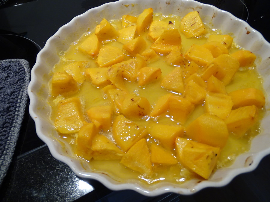Die Kaki wird mit dem Honig und dem Saft einer halben Orange gebacken.