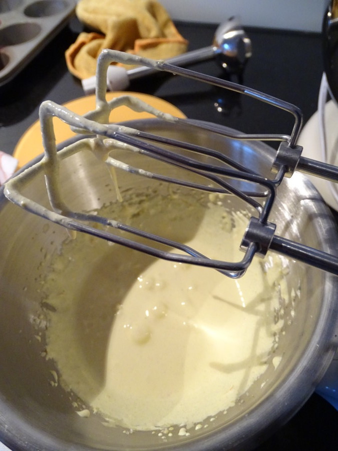 Nun wird die Masse, jetzt mit dem Gummischaber unterheben, auf Eiswasser auf Körpertempartur runtergekühlt.