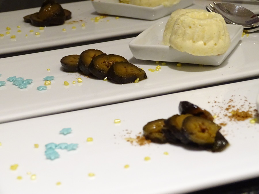 Die schwarzen Nüsse aus dem Glas nehmen. Sorgfältig ganz fein Schneiden und mit dem Parfait servieren.