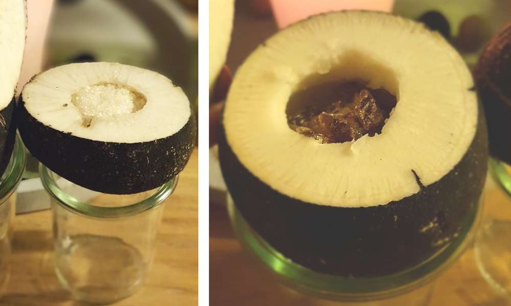 Meine Mutter hat mir vom Markt in Schaffhausen zwei schwarze Demeter Rettiche mitgebracht. Diesen habe ich den Deckel abgeschnitten, ein wenig ausgehölt und zweierlei Zucker als Test genommen.