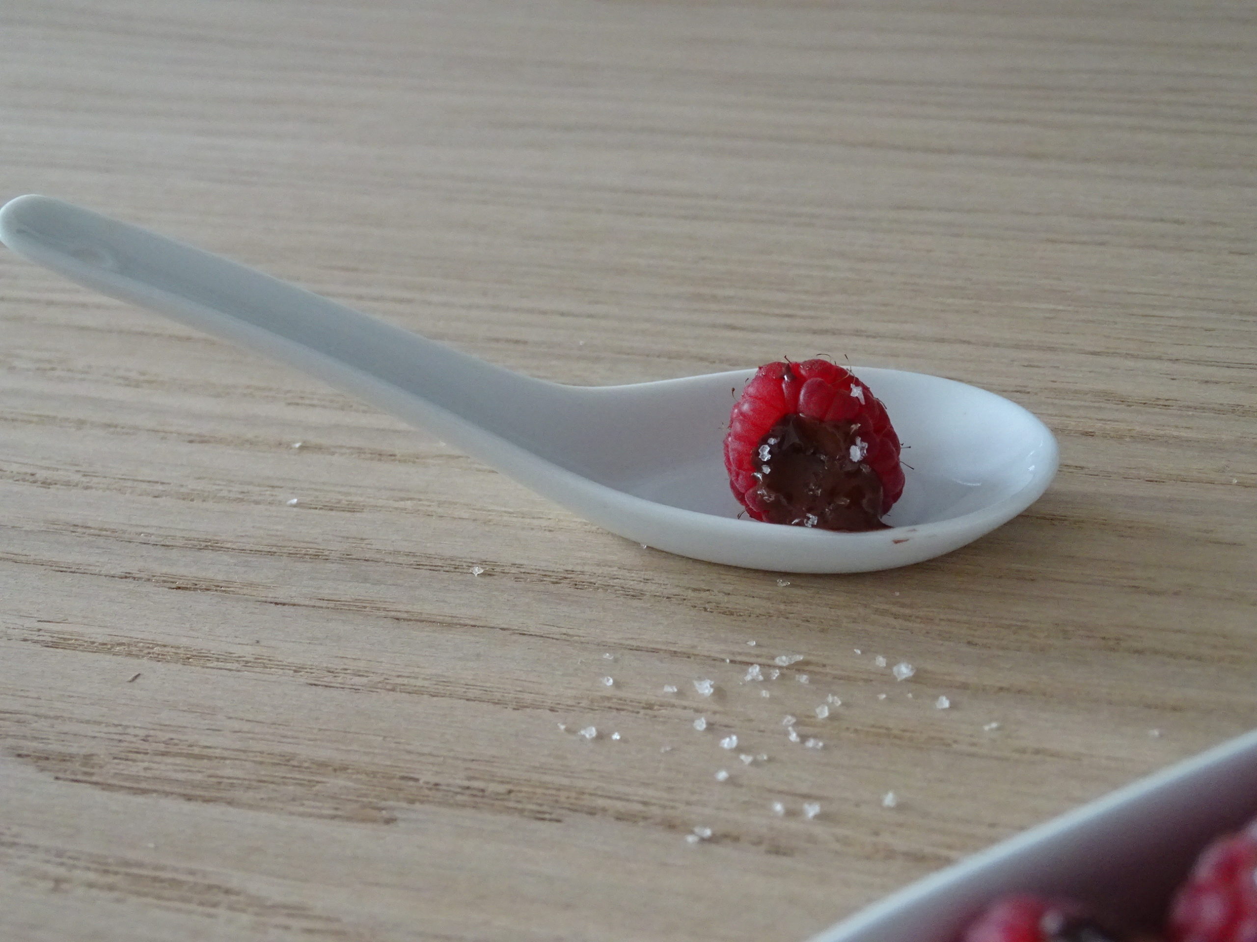 Wenn alle Himbeeren voll sind mit einem Hauch Fleur de Sel bestreuen. Achtung. Die Schoggi ca 15min fest werden lassen. Je nach Aussentempi im Kühlschrank.