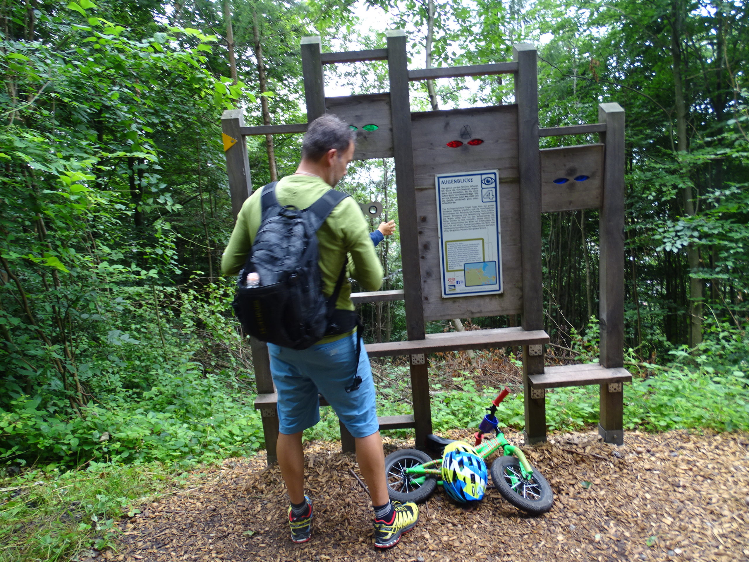 Mit den Augen – gehört auch zu unseren Sinnen hihi – kann durch farbiges Glas geschaut werden. Und der Wald durch den der Weg führt ist ebenfalls sehr schön. Zum Schluss kommt man, nur das ihr vorbereitet seid, an eine Wasserstation und einem Spielplatz. Sehr zur Freude meines Minis war dieser gut ausgestattet mit „Sändelisachen“.