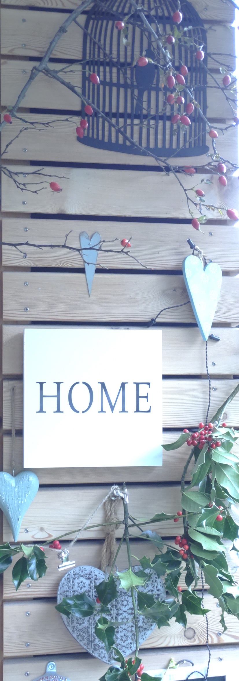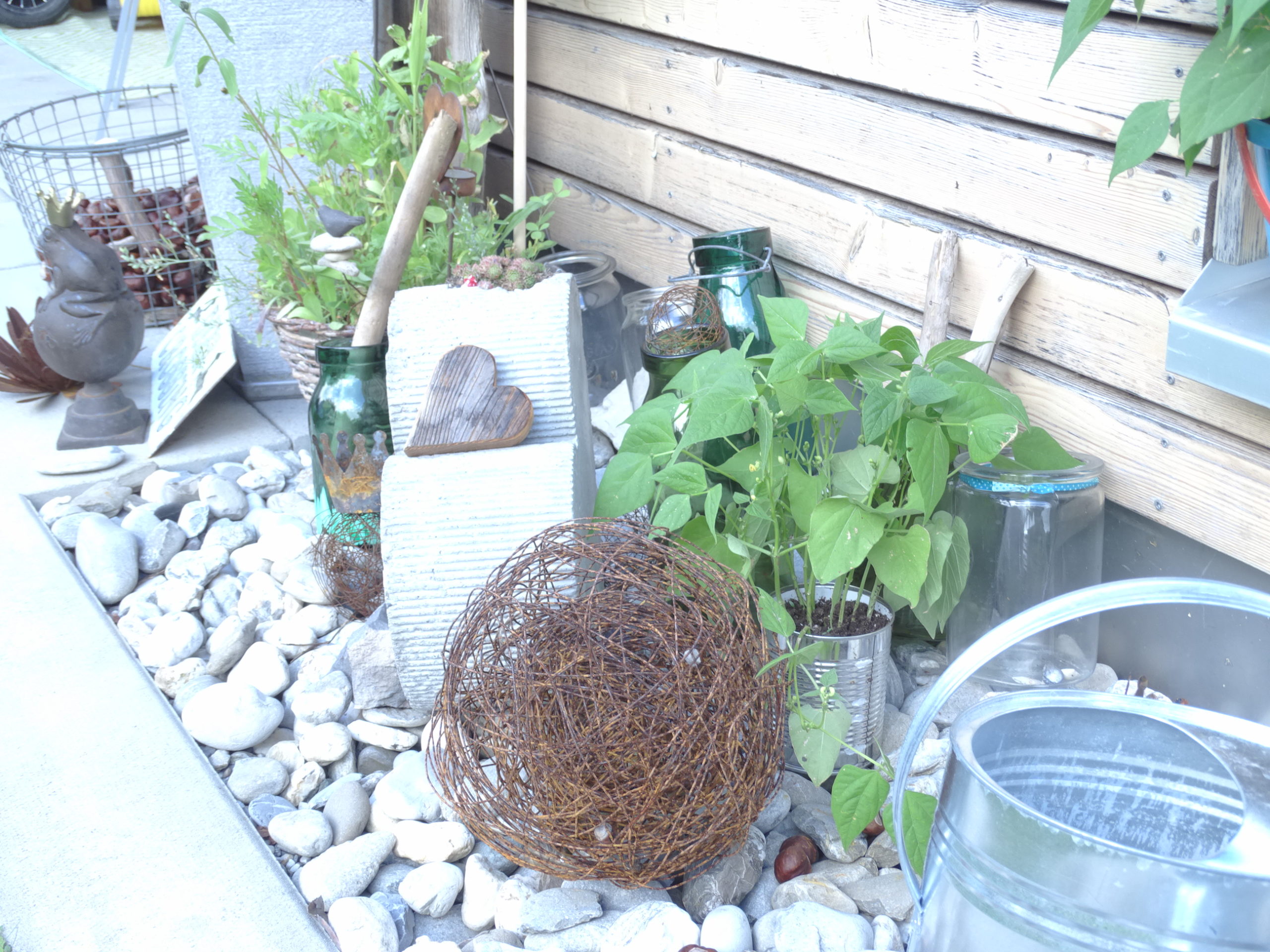 Kommst du mit raus? Ich zeige dir unseren Sitzplatz. Bereits sind wir bei Teil 3 meiner Führung durch unsere 4Wände. GG hat mit vollem Einsatz „mein“ Gitter an die Decke montiert. Nur schon die Beschaffung dieses Gitters war eine Tagesaufgabe! Das Gitter hängt nun seit zwei Tagen über unserem Esstisch und wurde schon liebevoll von mir Dekoriert. Windlichter, Hagenbuttensträucher, Rostkugeln, Buchennüssli und einige andere Kleinigkeiten wurden mit Rostdraht an „meinem“ Gitter aufgehängt.