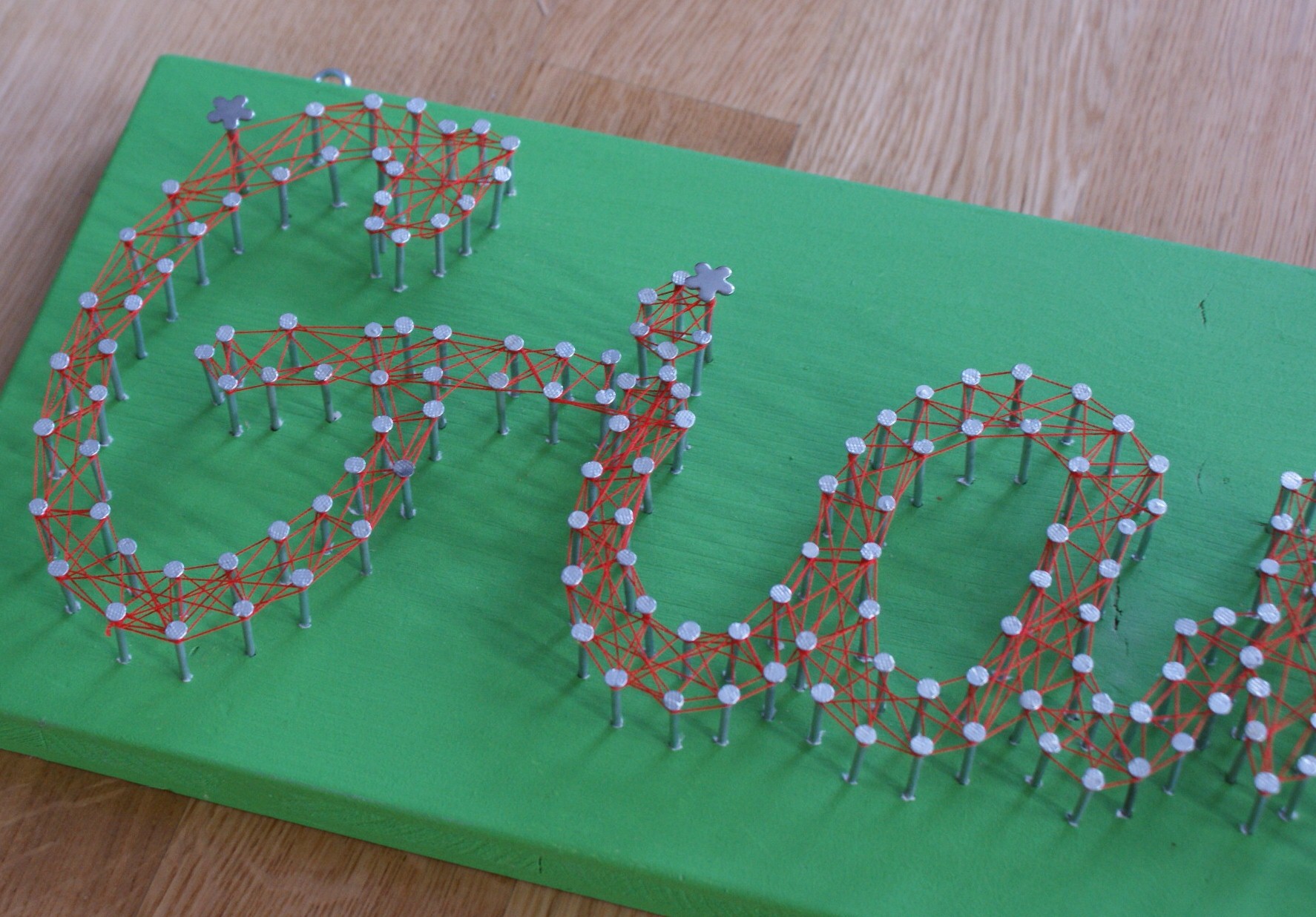 Sind alle Nägel drin, kannst du das Papier vorischtig wegzupfen. Nun beginnt die Endphase und dein Fadenspiel wird zum LEBEN erweckt. Wickle das Stickgarn um die Nägel und zieh immer wieder gut nach, damit das ganze nicht durchhängt. Et voilà!