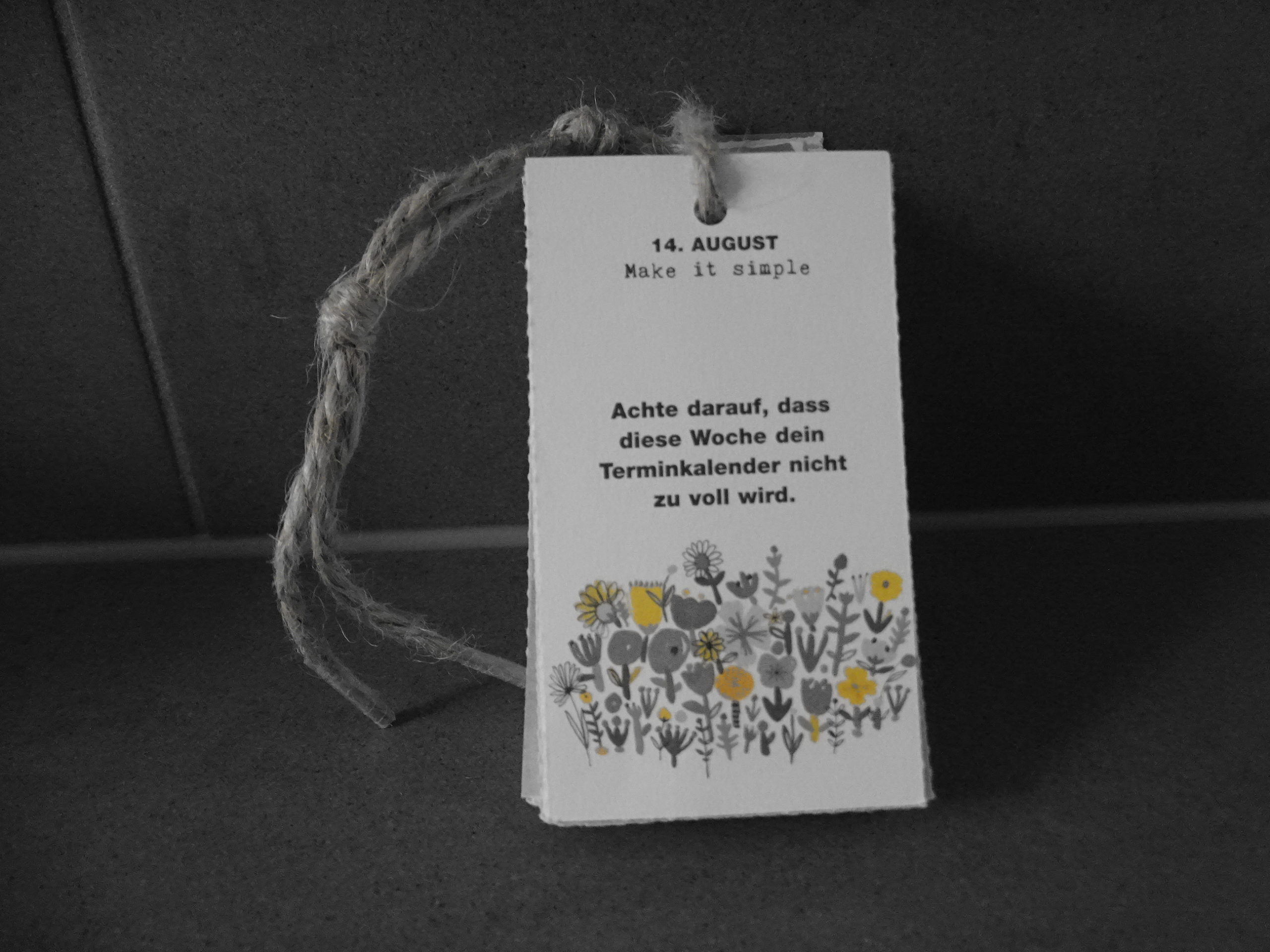 Ich habe voraus gegügselt. Mein Flow Kalenderchen hat am 14. August – an diesem Tag startet mein kleiner, grosser Mann mit dem Kindergarten. Und der Spruch könnte nicht passender sein. Nächste Woche steht bei mir rein gar nichts im Kalender.