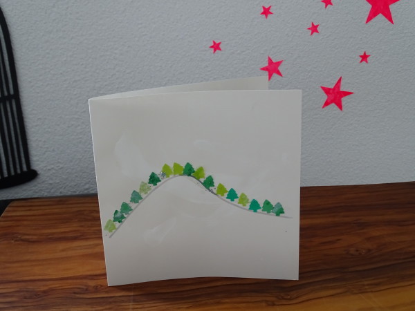 Viel Farbe, Wasser und die Finger durften grünes Papier vollmalen. Daraus habe ich mit dem Stanzer hunderte von Tannenbäume gemacht und diese auf einen Hügel geklebt.