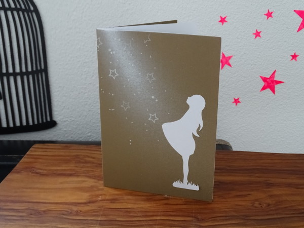 Inspiriert vom gleichnamigen Märchen habe ich anhand dieser Vorlage (Danke an dieser Stelle) das Sterntaler Mädchen ausgeschnitten. Mini-Me durfte Stempeln und mit dem Silberstift ganz viele Punkte auf die Karte machen. Mit einem weissen Lackspray habe ich dann ein bisschen nachgeholfen. Und wer das Mädchen behalten mag. Dieses habe ich mit einem remove Klebespray auf der Karte fixiert.