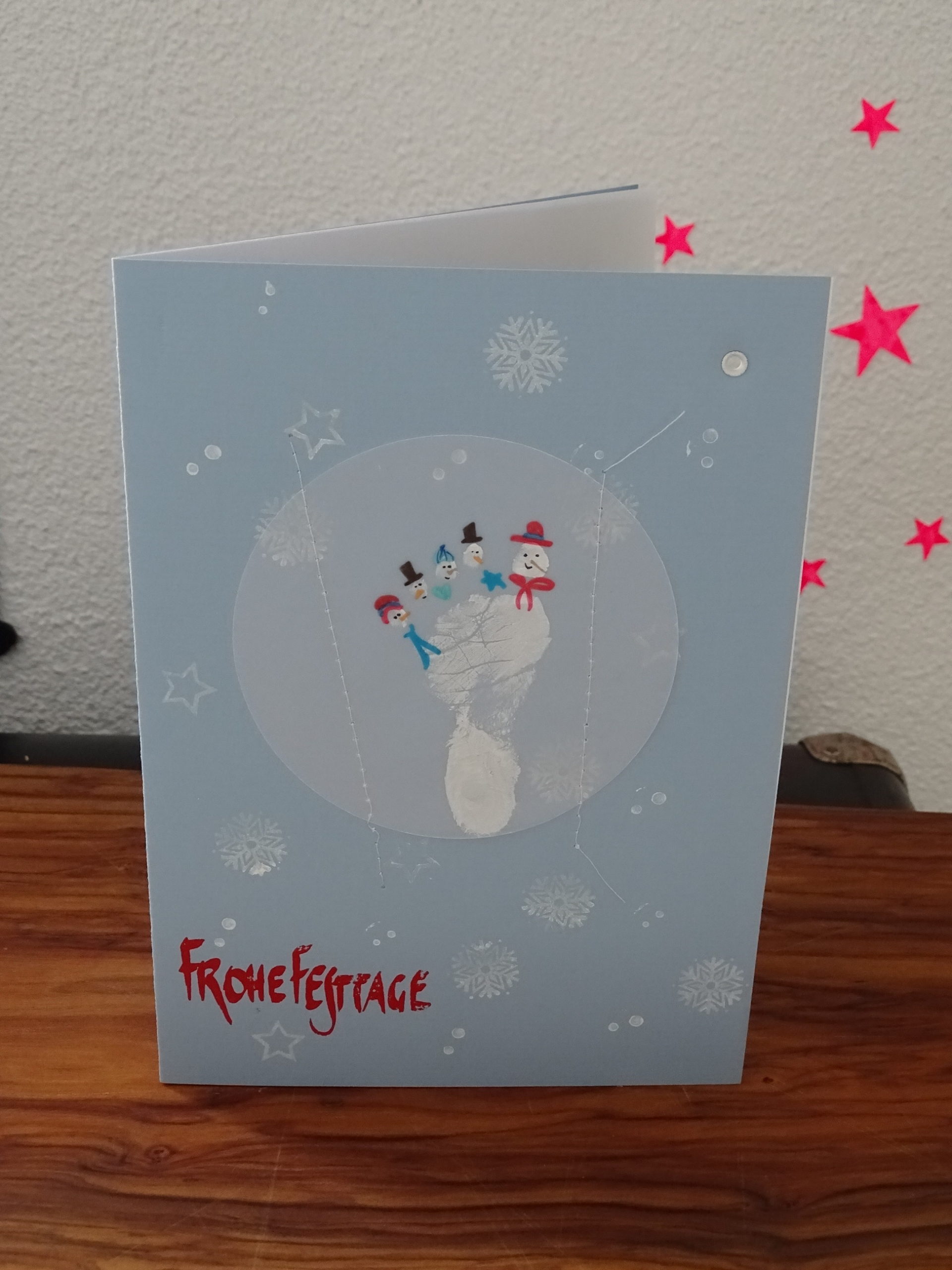 Mit den kleinen Fussabdrücken von Mini-Me habe ich kleinen Schneemänner gemalt. Das Papier rund ausgeschnitten und auf einer passenden Karte festgenäht. Und ganz ganz viel Schnee wurde gestempelt.
