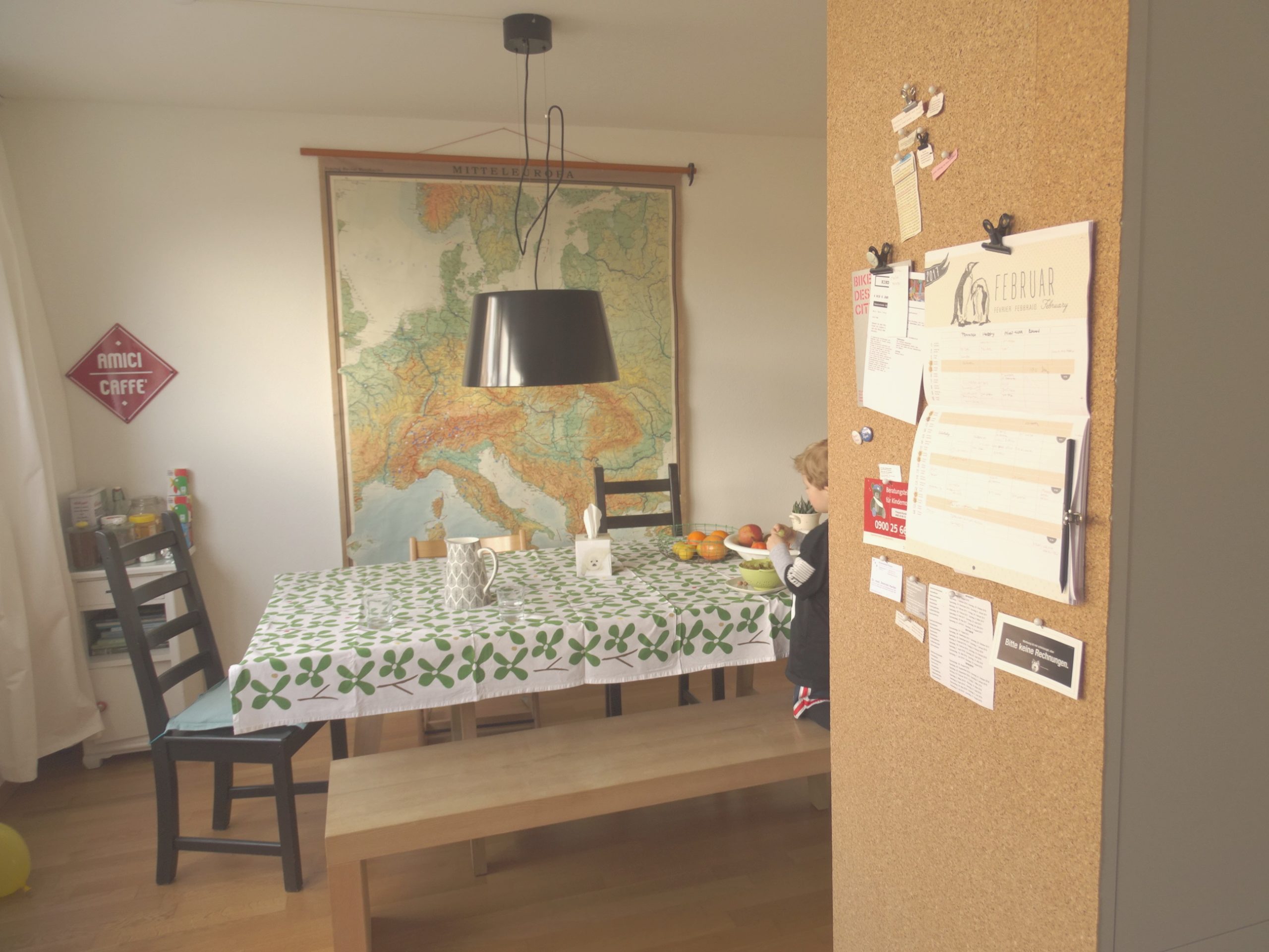 Im Esszimmer. Hier haben wir eine grosse Tafelkreide (mittels Folie) angebracht. Und mein Highlight und absoluter Liebling ist die riesige alte Schullandkarte. Meine Geografie Kenntnisse werden von Tag zu Tag besser. Überall wo wir schon waren, klebt ein farbiger Punkt. Einen tolle Sache zu sehen, wie viel untendeckte Regionen es für mich noch gibt. Bestimmt nehme ich euch immer mal wieder mit auf wenn wir mit dem Bus auf Tour sind.