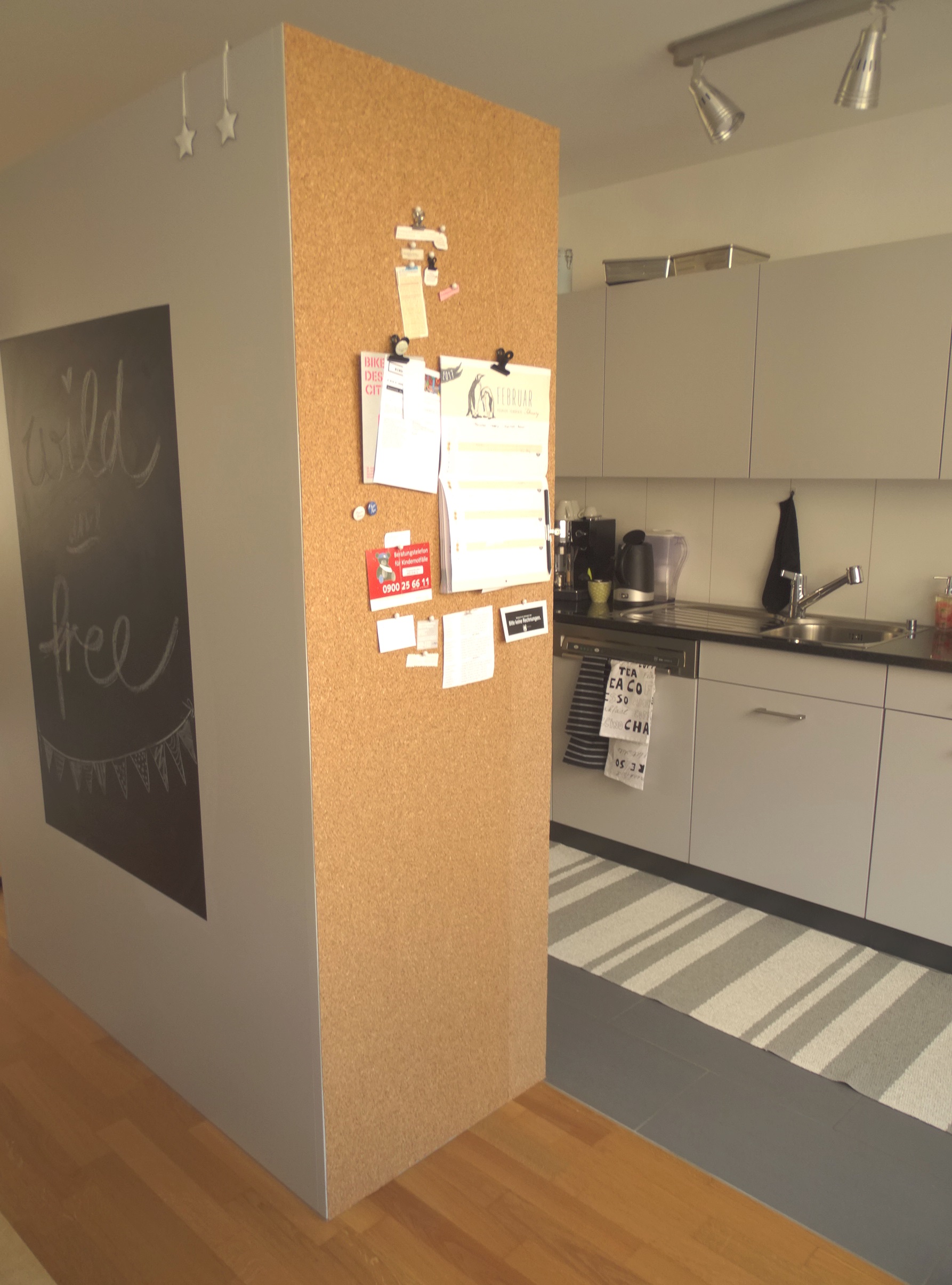 Ganz neu ist die Korktapete an der einen Seitenwand der „Kücheninsel“. Im Nu sieht die Zätteli-Wand viel ruhiger und ansprechender aus. Würde ich es nochmals machen, würde ich darauf achten dickeren Kork zu nehmen. Denn dieser ist kaum 3mm dick und somit nicht ganz ideal um etwas ran zu pinnen. Den Kork habe ich mit ultrastarkem und ganz breitem Doppelklebeband festgemacht.