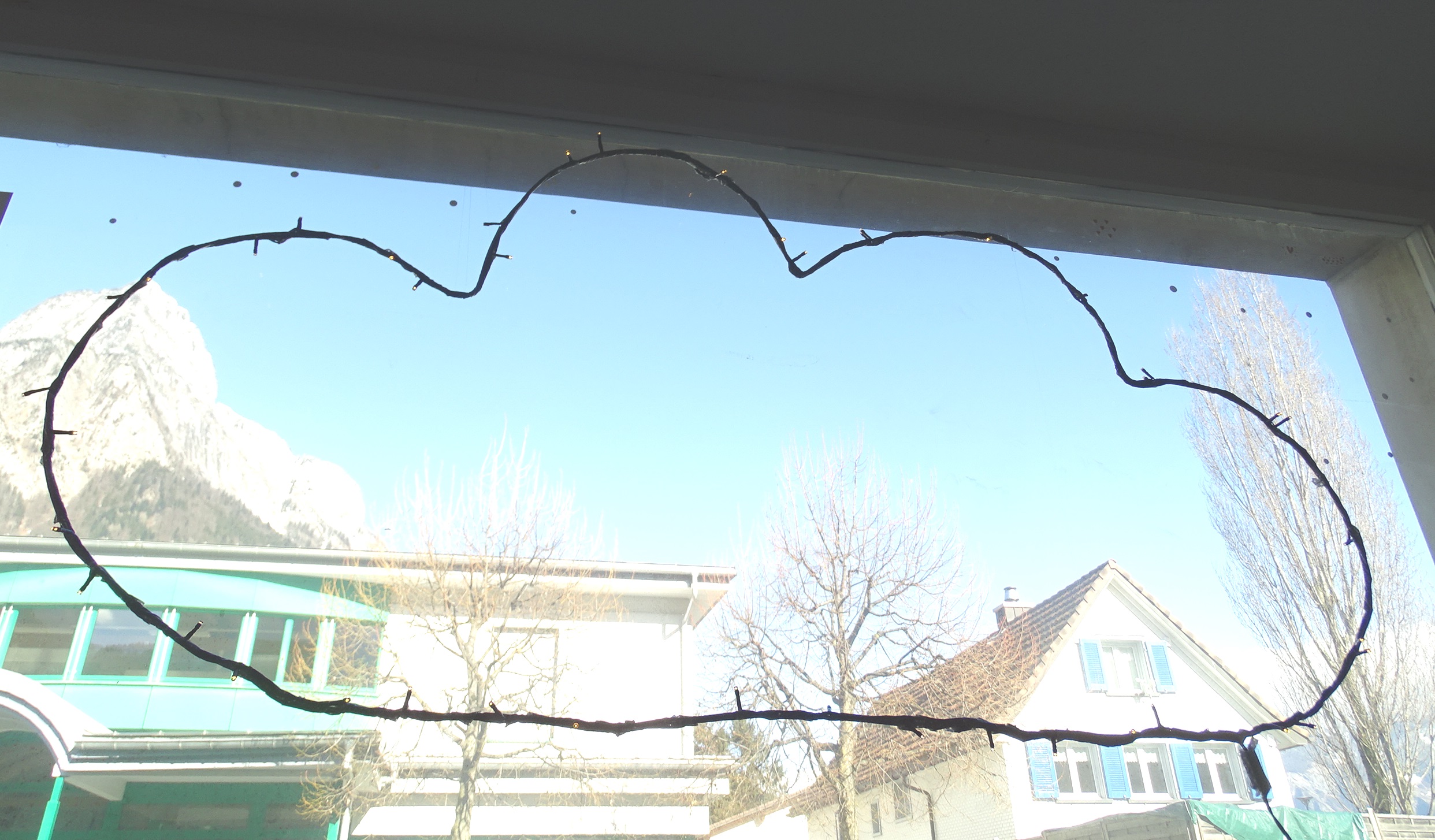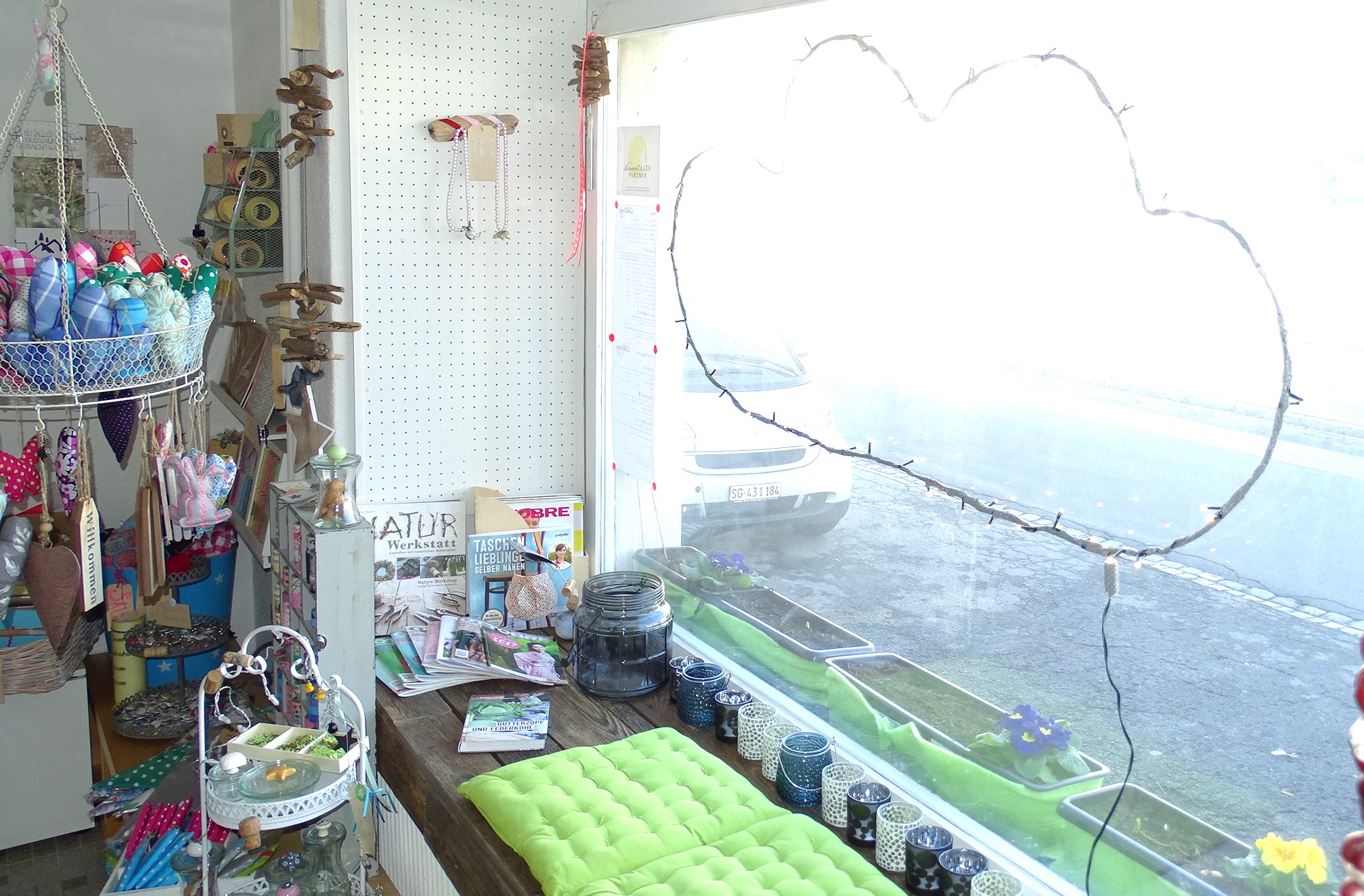 Wo meine Wolkenliebe hinkommen wird, wusste ich ebenfalls sofort. An das grosse Fenster im Lädeli. Inkl. Zeitschaltuhr, damit sich die Fussgänger, Heimkehrer, Spaziergänger, Hunde-Gassi-Geher jeden Abend daran erfreuen können. Ich werde morgen, nach dem Training bestimmt auch einen Bogen via Lädeli fahren. Weil Sie so hübsch ist 😉 meine Wolke7.